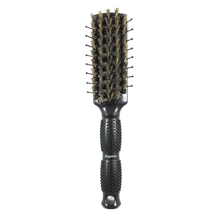 Лёгкая и комфортная щетка на термостойкой пластиковой основе облегчит укладку и сэкономит время при работе. Гибкие штифты с закругленными кончиками из высококачественного термостойкого ионного нейлона обеспечивают максимальный захват и контроль над волосами во время работы, натуральная щетина, расположенная по углом к основанию обеспечивает исключительное «выглаживание» волос, делая их шелковистыми и блестящими. Сквозные отверстия в корпусе щетки продуваются воздухом фена, что обеспечивает быстрое высыхание волос и фиксацию результата. Удобная прорезиненная ручка со специальным рельефным покрытием предотвращает скольжение. Использование щетки "Ультра блеск" "Kapous "позволяет выполнять классическую укладку, выпрямлять волосы, создавать прикорневой объём и объем по длине.